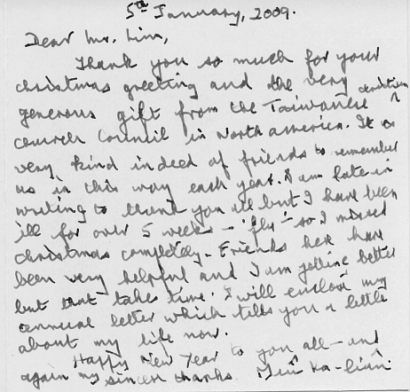 謝謝您聖誕節的問候以及來自北美臺灣教協的慷慨。朋友們每年以這樣的方式記得我們,真是太好了。很抱歉我這麼晚才回信謝謝您。我已經生病超過五星期了(流行性感冒),所以我也完全錯過了聖誕節。這裡的朋友幫我我很多,我已漸漸好轉。等我好一點,我會再給您寫一封信,多講一些我現在的生活。